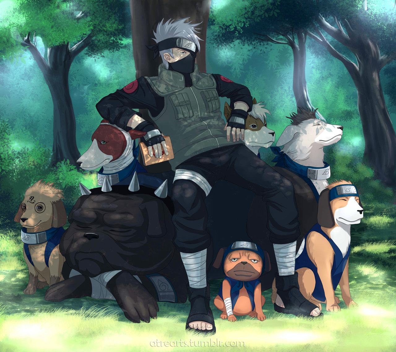 This fantastic artwork of Kakashi alongside his dogs was done by AtreJane. If you like this, she has a large number of fantastic pieces of fan art and original art which are absolutely amazing. If you like this, go ahead and share this with fans of Naruto and Kakashi.